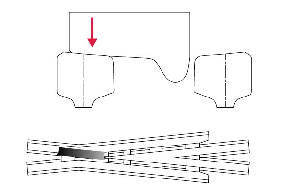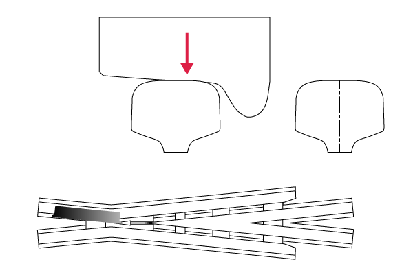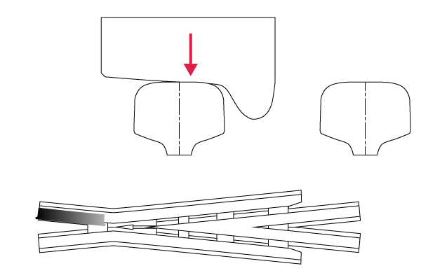 騒音の低減と走行速度向上を目指して開発した可動クロッシングです。ノーズレールが弾性転換することにより、欠線部を解消します。