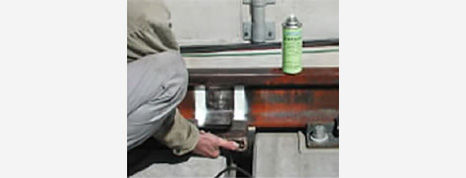 Fine surface defects are inspected by applying penetrant to the welding zone, wiping away the surface, and spray developing powder. This inspection is performed for Goldsummit welding and enclosed arc welding.