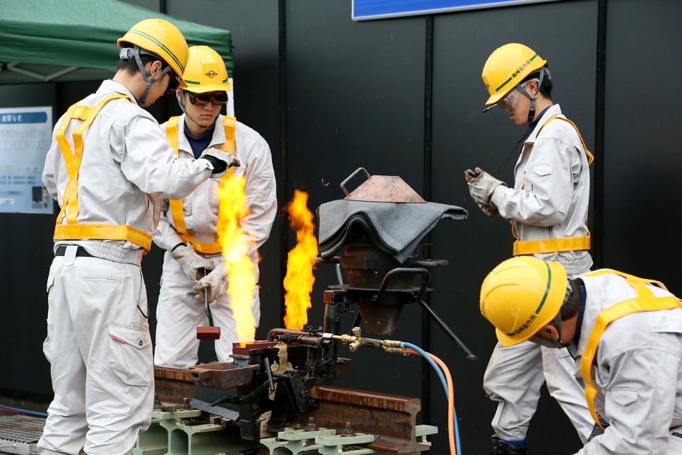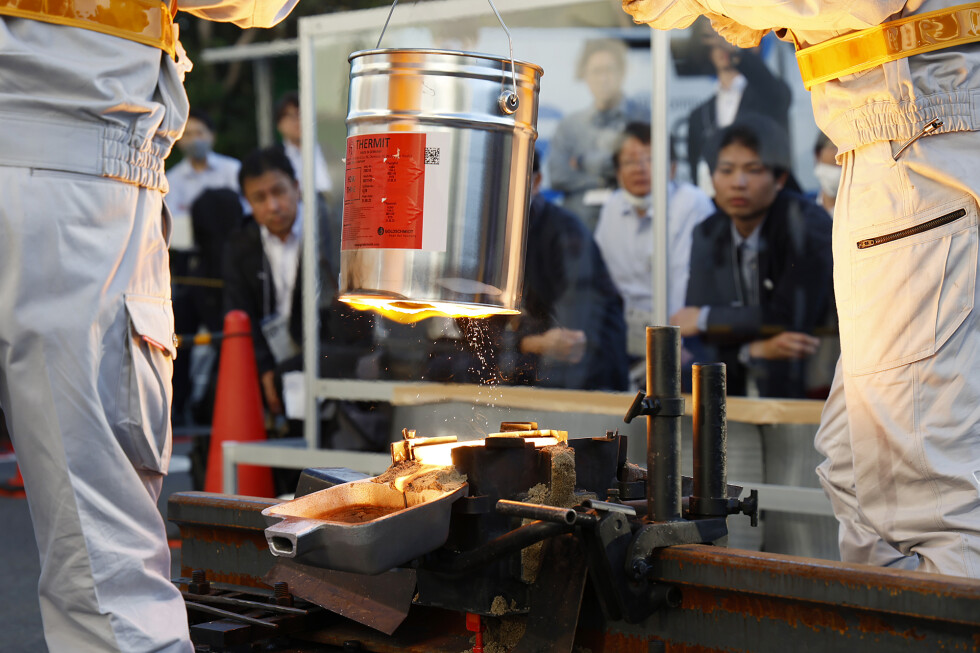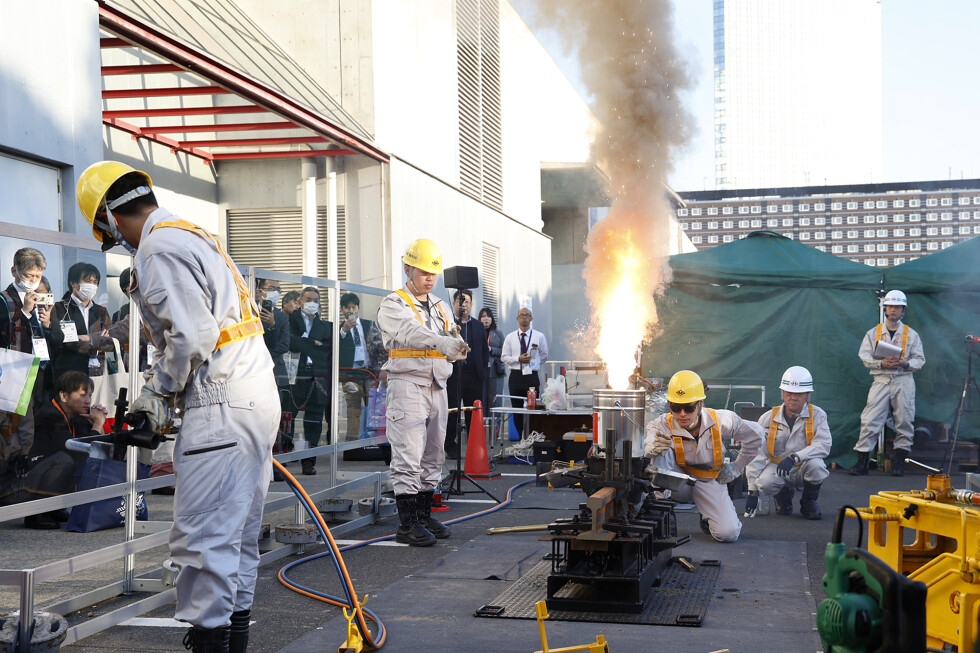 屋外展示ブースでは、初日はゴールドサミット溶接およびテルミット頭部補修溶接のデモンストレーションを実施しましたが、