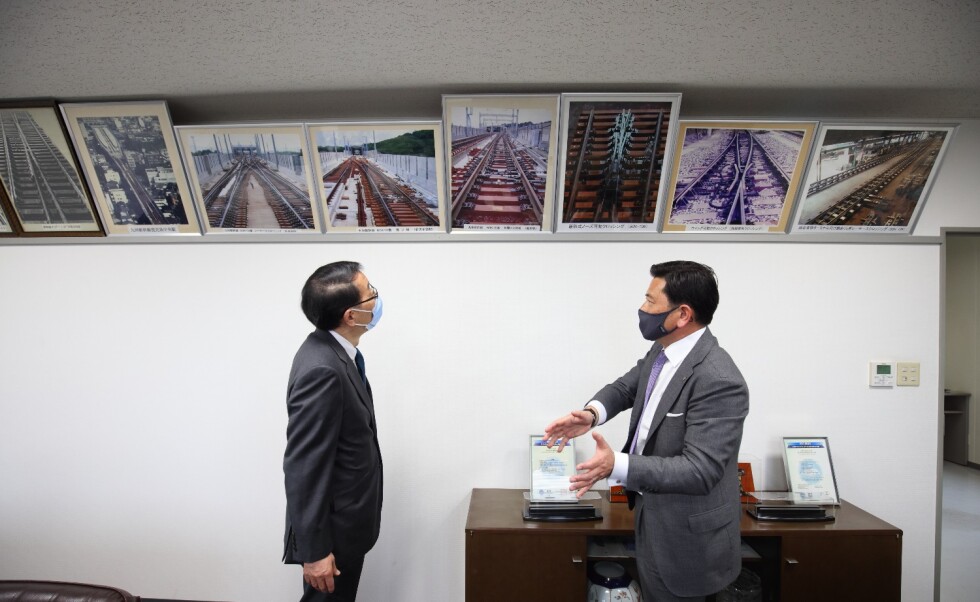長年にわたり、高い信頼性に担保された施設用品の納入により、安全安定輸送を支えたとして、資材調達パートナー感謝状をいただきました!(写真は感謝状贈呈式で挨拶をする、社長の峰です)